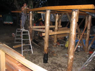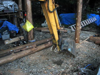 | ★サボっていられません 9月8日 昨日の定休日の朝、まっつあん・熊さんは元気に?帰って行きました。 ありがとさん! 旬ちゃんご一行も午後から帰途に・・・。 寂しくなりますな〜。 「鉄は熱いうちに打て」 とばかりに、開き時間に作業するマスターです。 ツリーハウスの土台は完成したので、デッキの足を立てることに。 その前に、道具や材料をすぐ近くに置く簡易棚を作ります。 先ずは整理整頓が安全作業の第一歩! ![]() 次はハウス部の基礎三方に、デッキ部の根太を載せるための大引きをボルトで取り付けます。 (下の写真で、色の濃い材木がそうです) ![]() そして本番!ボイド菅のある丸太立ては慣れたもので順調に一本! ただ一人なのでユンボが相方です。 おや〜?なんかおかしいですね〜。 (上の写真) そうです! デッキのボイド菅の位置が、大引き用の四寸柱の長さよりちょっと遠く・・・足しました!!ハイッ!! 「素人仕事はこんなもん」 と独り言のマスターでした。 次の柱からはボイド菅が無いので、しばし思案したマスター・・・。 「エエわい〜。下手な基礎作るより丸太を直接埋めましょ!!」 腐ったら交換したらええやん〜 一人での労力とコスト考えたら、やっぱりこれがベターかな? とは言え丸太をそのまま埋めるのは・・・という事で 焼いてコールタールを塗ることにしました。 ただ、コールタールを買いに行くと、お店の人が金属の防腐剤はコールータール! 木材はクレオソートと言い張るもので弱気なマスターはクレオソートを購入! どっちにしても劇薬・環境に優しくないものなので・・・注意と少々反省・・・ 丸太焼きはガスバーナーを使ってたっぷりと焼きましょう ゴーって良い音がします。 火遊びは おねしょ しそう〜 この日は3本の丸太を焼いて20時終了! お店がマスターを呼んでま〜す。 ★丸太が残り3本しかないので〜 9月9日 昨晩に焼いた丸太3本! こんがり焼けてます。クレオソートを塗ります。 3度も塗ったのでテカテカしてます。 あたり一面に匂いが凄いです。正直、喉が痛くなります。次回までに防毒マスク?を買って来ましょう。 丸太を立てるまでに一仕事! 最初に樹に井桁を取り付け大引きを仮付けしているのですが、どうも短い!樹とのバランスが良くなさそう。 設計変更です。樹の外側まで大引きが伸びるようにしましょう。 ![]() 地味な作業の連続で〜す 大引きを外して付け替えです。 ![]() さ〜本番の丸太立て! 一人で穴を掘り、焼き丸太をユンボで吊って立て埋めます。 安全第一 レッツゴー!! ![]() ![]() 立てた丸太の垂直を確認し仮固定し、この日の作業は終了です。 いや〜思ったよりもうまくいきました。 ★前の日から会津の友人が 9月10日 昨日は会津から友人が御岳登山とあわせて二人遊びに来ました。 夜はバタバタと忙しく、あまりお構いできませんでしたが、ごめんね〜 「トムソーヤを手伝うのも目的よ〜」と嬉しいことを言ってくれるので、帰るまでの一時お手伝いをお願いすることに。 先ずは昨日立てた丸太を、他の丸太と高さを合せて、真剣水平切りです。 (写真ありません〜本当は欲しかった・・・) チェーンソーで水平に切るって初めての経験〜 なかなか、上手くいきました。 後はブリキをカンカンと・・・雨避けキャップを取り付け、大引きを取り付け他の柱と固定します。 ![]() 二本目の丸太の建立〜 ![]() 穴掘りですが・・・ 掘る位置がおかしいような・・・ この時、目印に板を置いたのですが・・・ ユンボのマスターは別の板を間違って掘りかけました・・・ こんな何でも無いときに事故や間違いは発生する! の巻 気を取り直し、再びチャレンジ〜 掘った穴に丸太を入れ、周りに土を入れ仮固定します 仮固定した丸太をユンボのシャベルで「えいや〜」と打ち込みます。 ほら〜危険なので誰も丸太の側にいません〜 ![]() 上手く打つと、一回で10cm以上打ち込まれます。 爽快〜!! 失敗すると丸太が倒れます・・・ グスン・・・ ![]() 後は丸太を垂直に調整し、廻りの土を突き固めます。 ![]() ちょっと痩せたかな〜 おいおい! お昼までお手伝いしてくれ、友人達は帰路に。 片道7時間半!!頑張って気をつけて〜〜ありがとう〜 お昼からは高さを合せて、水平に切断した丸太に雨避け・大引きを取り付け固定します。 お〜写真が・・・ ママちゃんと撮ってください・・・予定地の右半分、これで柱立ては終了と思っていましたが、樹の井桁だけでデッキが耐えれるか・・・ 少々心配になり補強用の柱を樹の近くに立てます。 ![]() 井桁と合せて高さ調整が可能なように金具を付けてみました。 よ〜し!! 暗くなってきましたが、ここは一発。 残りの大引きと羽子板の穴などをやっちまいましょう。 ![]() あ〜ここまでの作業・・・何連荘だったでしょう・・・ お店の仕事とセットで、そろそろ体力の限界じゃ〜 という事で、今日はここまで・・・ 一旦休憩じゃ〜 |