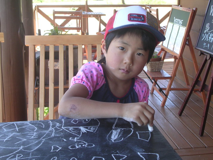 夏休み ウッドデッキで看板にお絵かき トホホ!