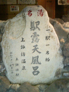 木曽福島までバスに揺られ、塩尻で乗り換える。 たとえば新宿まで切符を買ってると、途中下車とかできたりするので、 遅めの特急を買って、ブラブラすることにしてみました。 岡谷駅 0番線ってなんだろう?  上諏訪駅 なんと、駅のホームが温泉です! 足湯、入ってみました〜 5分で汗かけます・・・10分でビールがうまくなります♪    で、その上諏訪駅の改札を出ると、Newdays(関東ではおなじみ)があり、 アイスクリームがなんと50円! 風呂上りにgood! 指が太い人はちうい!   そして、お弁当と、魔法の黄金の水♪♪ 塩尻駅の駅弁だそうで、鶏そぼろ、天ぷら、野沢菜がいい感じでしたよ♪   そしてホロ酔いのまま、2時間も走れば新宿です。 近いもんですよ〜